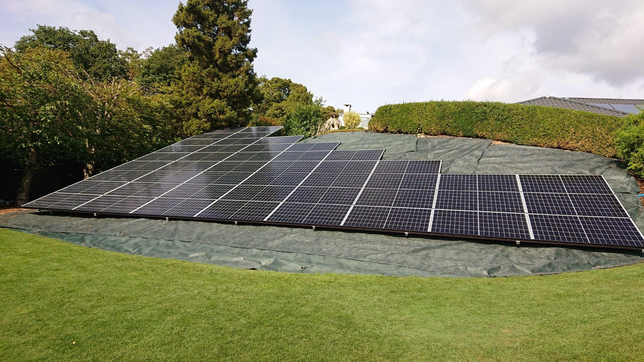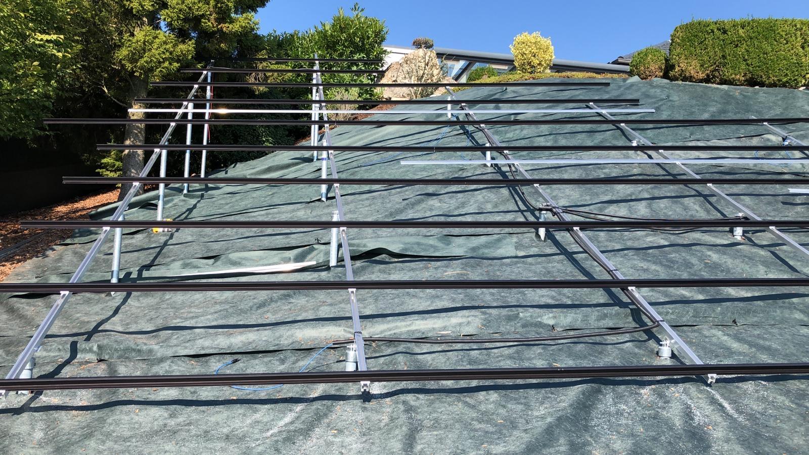 Bien intégrée, installation composée de 46 panneaux photovoltaïques d'une surface de 77m2 sur 26 pieux métalliques vissés dans le terrain.